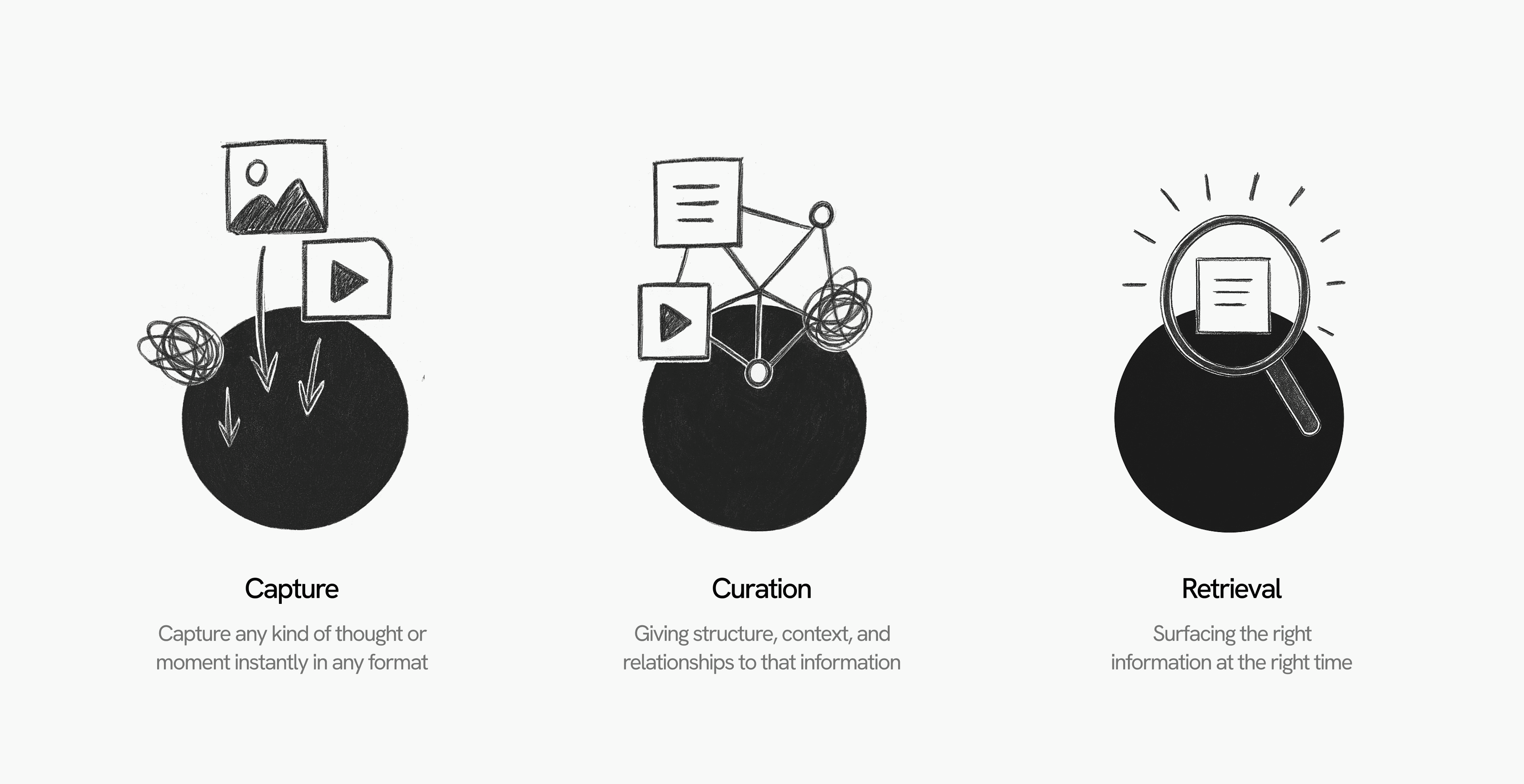 Our goal is to establish Memotron as a foundational system for digital memory. After understanding how memory breaks down, we defined three essentials for effective memory: capture, curation, and retrieval.
